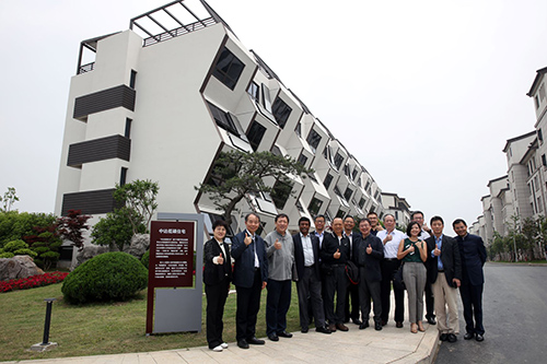 評審專家們參觀吳江同里湖畔2011競賽一等獎作品、由臺達集團投資建設而成的“中達低碳住宅”