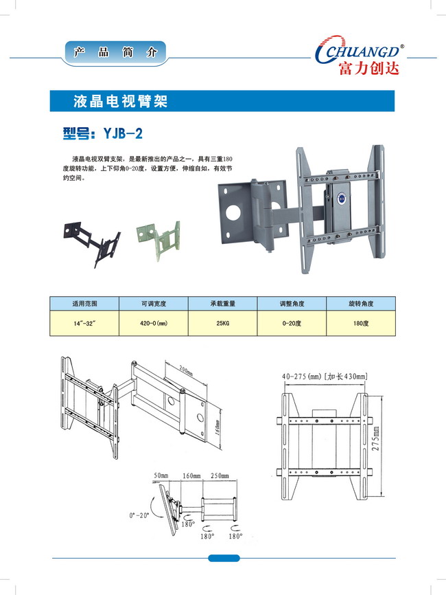 液晶電視雙、單壁支架,是最新研發的新產品,具有三重180度旋轉功能,上下仰角0-20度,設置方便,伸縮自如,有效節約空間