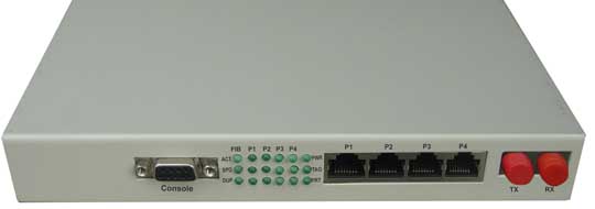 光纖收發器為光傳輸VLAN交換機,共有五個交換接口,其中一個接口為光纖接口,通過此接口可以延伸本地局域網。另外四個為10M/100M以太網接口。各個交換接口能進行VLAN劃分,有兩種類型的VLAN劃分方式,一種為基于PORT的VLAN劃分,此種劃分方法不影響遠端設備 ;另一種為基于802.1Q的VLAN劃分,此時本、遠端的接口可劃分為相同VALN 。具體VLAN的劃分可通過Console口進行控制。本光纖收發器帶Console口,支持超級終端控制設備。