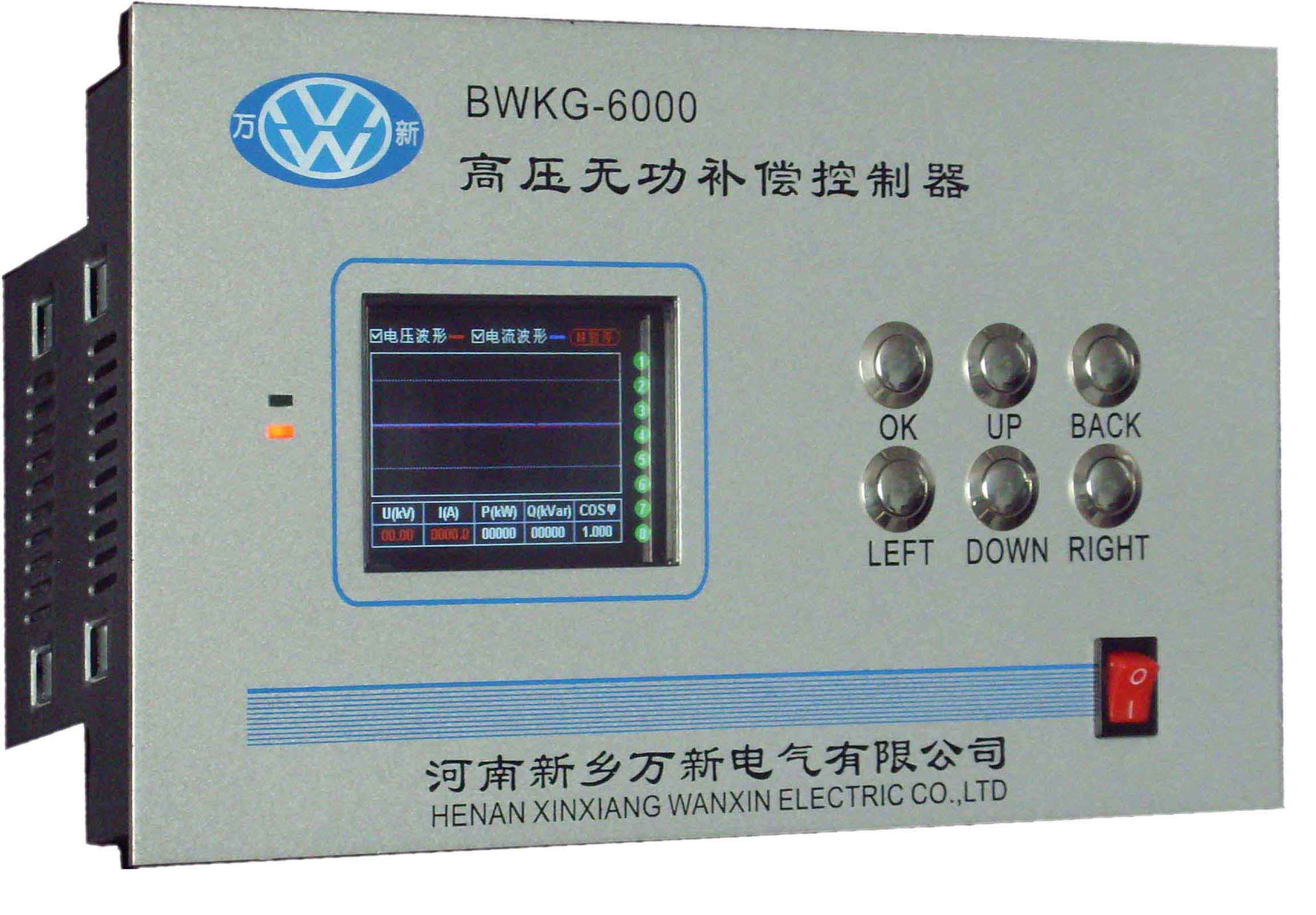 BWKG-6000系列高壓無功補償控制器是全新一代高壓智能無功補償控制器,采用了彩色全中文液晶顯示,人機友好界面,諧波檢測功能完善,不但有各次諧波的電壓電流畸變率,同時顯示對應各次諧波的柱狀圖,可更直觀的觀察到電網諧波狀態。強大的數據存儲功能,提供了故障查詢的數據支持,支持按年,月,日,小時查看各電網參數(無功功率,功率因數,電壓,電流,有功功率,視在功率,諧波畸變率)的最大值,最小值,以及在時間段內的波形趨勢圖。本控制器具有各種保護功能,如過壓,欠壓,過流,欠流,諧波,拒投,拒切等等,并且帶開入量保護等。