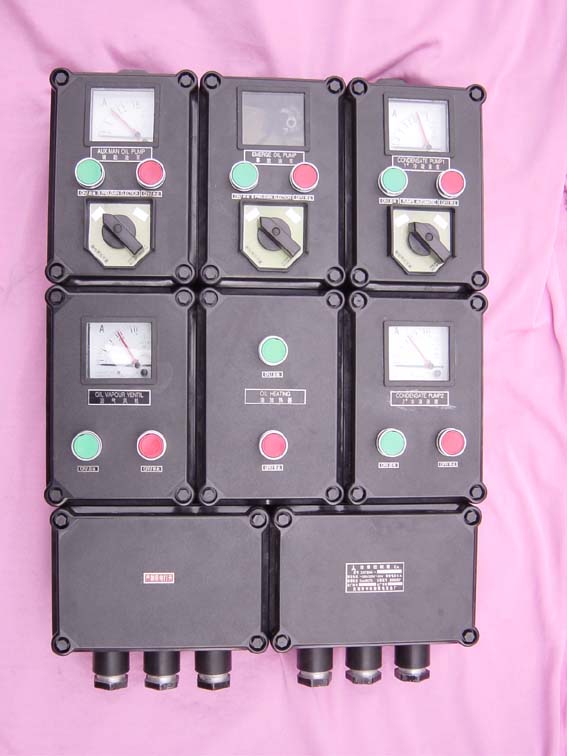 產(chǎn)品特點(diǎn):防爆控制箱一般為復(fù)合型結(jié)構(gòu),外殼采用增安型結(jié)構(gòu),內(nèi)裝元件采用隔爆型元件或增安型的元件,或一個(gè)隔爆型主腔內(nèi)裝各種元件;  或兩種結(jié)構(gòu)結(jié)合成一體;外殼采用采用高強(qiáng)度鑄鋁合金制成,外表面靜電噴塑,內(nèi)裝的元v件有按鈕,控制開關(guān),儀表,繼電器或各種功能模塊,其中按鈕控制開關(guān),電流表和電壓表,指示燈均為防爆元件,控制箱內(nèi)部元件功能,控制開關(guān)有多種功能可供選擇.指示可根據(jù)用戶的要求進(jìn)行排列,可實(shí)現(xiàn)多種燈也有多種顏色可供選擇,由于該產(chǎn)品變化多端訂貨時(shí)請?zhí)峁┚路圖. ※符合GB3836-2000,IEC60079標(biāo)準(zhǔn)要求