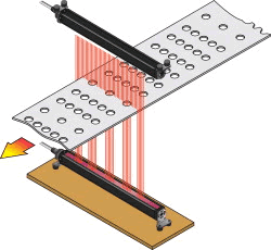 MYD系列測量光幕由發(fā)光器和接收器組成,發(fā)光器發(fā)出的光直射到接收器,形成光幕系統(tǒng)。放置在發(fā)光器和接收器之間的目標(biāo)物體將會(huì)阻擋一部分光線使其不能射到相應(yīng)的接收器器件。MYD系列測量光幕使用同步掃描來識(shí)別被擋的通道。首先一個(gè)發(fā)光器通道發(fā)出光脈沖而對應(yīng)的接收器同時(shí)來尋找該脈沖,當(dāng)找到后即完成一個(gè)通道的掃描,接著轉(zhuǎn)向下一個(gè)通道,直到所有的掃描都完成。當(dāng)一個(gè)周期掃描完成后,系統(tǒng)記錄哪些通道通光,哪些通道被遮擋,根據(jù)系統(tǒng)定義輸出一個(gè)信號(hào),該信號(hào)可以的模擬量信號(hào),也可以是開關(guān)量信號(hào)。