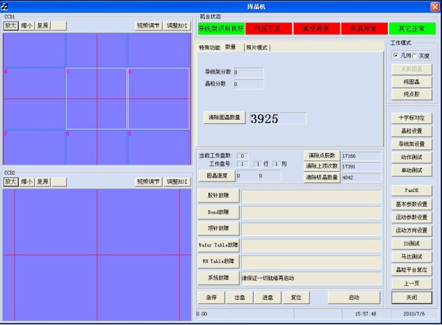 創科固晶機控制系統是創科公司在CkVision視覺開發平臺上二次開發的一款軟件,可自動檢測多個晶片的位置,同時檢測晶片的好壞。結合了運動控制卡,靈活控制了整臺機十一個軸的動作。