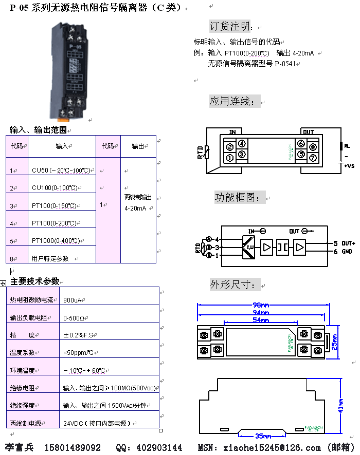 P-05系列無源熱電阻信號隔離器(一入一出) 帕羅肯科技有限公司