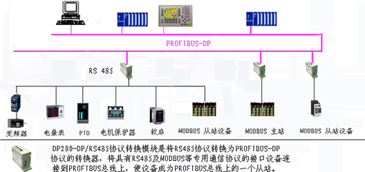 整個生產線是以施奈德儀表、PLC進行系統集成為主,來監視和控制高爐的整個工藝流程,主要包括制粉、吹風、卷揚系統等。遺憾的是鋼鐵廠采用的絕大部分儀表是MODBUS通訊協議,只帶有485接口。如果可以實現MODBUS協議與PROFIBUS DP現場總線的聯網,就可以完成整個生產線的改造升級。