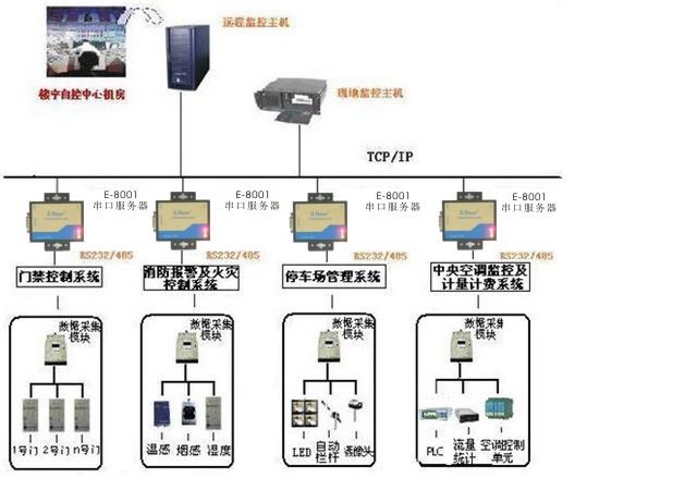 接入方式:是將前端數據采集或控制模塊(接口 RS232或RS485)通過E-8001串口通訊服務器接入以太網,從而實現中心機房PC對多棟樓宇網絡化監控和管理。