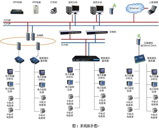 該電能管理系統采用分層分布式計算機網絡結構,即站控管理層、網絡通訊層和現場設備層組成,見圖1。