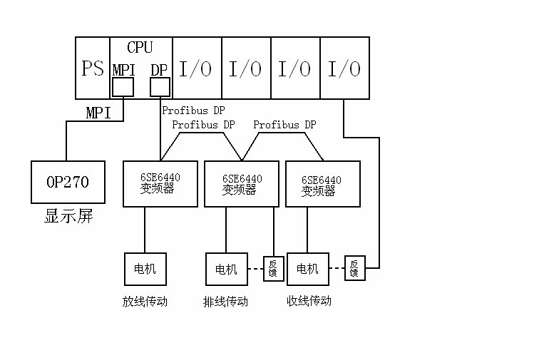 本系統(tǒng)采用西門子S7-300可編程控制器進(jìn)行邏輯運(yùn)算,并根據(jù)設(shè)定的參數(shù)和采樣得到的數(shù)據(jù)經(jīng)過CPU運(yùn)算,得到了放線、收線和排線的參考速度,再通過Profibus-DP方式實(shí)時(shí)地傳送給變頻器。同時(shí),經(jīng)過計(jì)算的放線、收線和排線的參考速度及班產(chǎn)量等通過MPI方式實(shí)時(shí)的傳送給顯示屏。顯示屏不僅用于顯示各個(gè)傳動(dòng)軸的系統(tǒng)參數(shù)及產(chǎn)量等,還可以設(shè)定收線的棍子直徑、線徑及棍子的寬度等與控制有關(guān)的計(jì)算用數(shù)據(jù)。